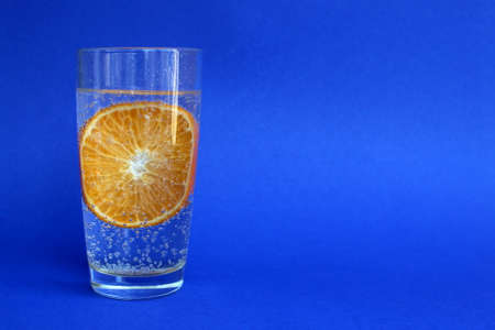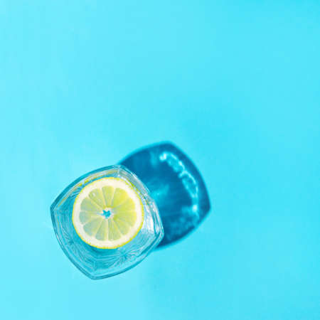 Lemon in a glass of water with shade. Place for text. Blue background.