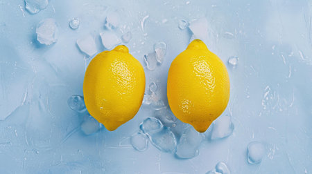 This vibrant image showcases fresh lemon slices, ice cubes, and green leaves arranged artistically on a blue surface, ideal for promotions or summer-themed content.