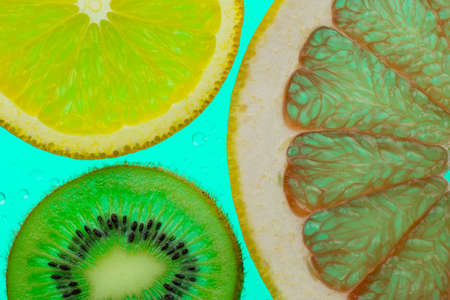 Summer juicy round slices of different fruits isolated on blue background, grapefruit, watermelon, kiwi, apple and orange