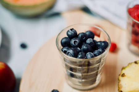 tasty healthy eating vegetarian vegan detox breakfast with fresh seasonal fruits and berries served on chopping board over pastel blue background