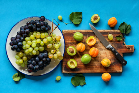 top view of fruits as grape pluots plums nectacots on cutting board and grape berries on blue background with copy space