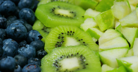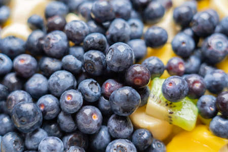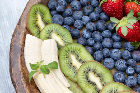 Fruit salad with fresh blueberries, bananas, kiwi and mango
