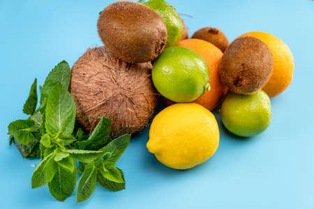 Ingredients for the healthy foods selection.Mix of different fruits grapefruit, kiwi, tangerine, apple, lime, sicilian orange, orange and banana