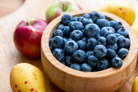 Fresh fruits in a wooden bowl on a blue background. Healthy food concept.