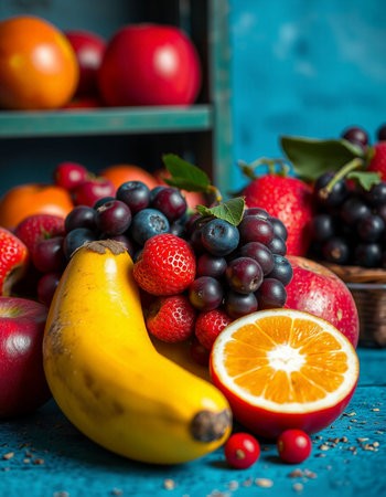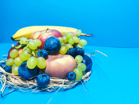 Fresh Assortment of Summer Fruits in a Basket on a Blue Background