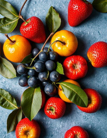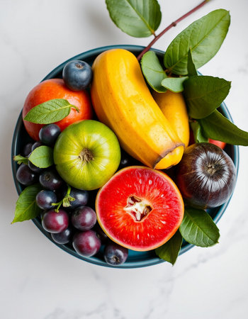 Top view of assorted fresh fruits and berries. Perfect for healthy eating, fresh produce, and summer themes.