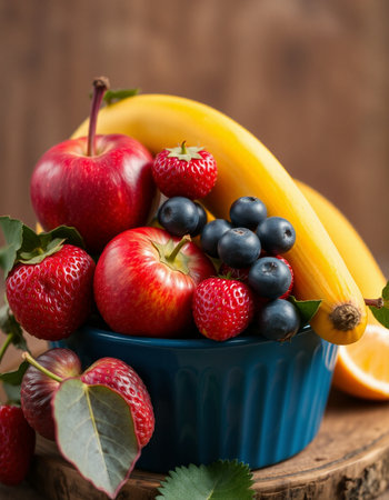 Fresh fruits in a blue bowl on a wooden background. Selective focus.