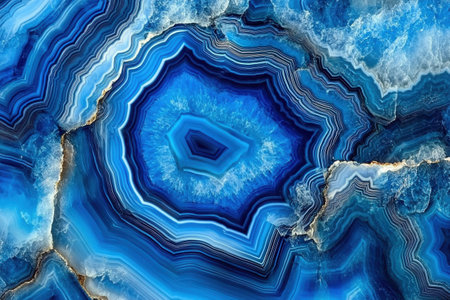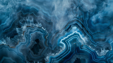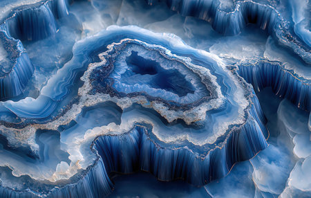 Blue agate geode with intricate banded crystal patterns and concentric layers. Macro mineral texture ideal for abstract backgrounds or interior design.