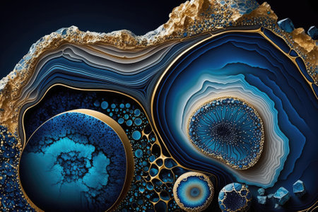 An overhead view displays an abstract composition of blue, white, and gold mineral patterns. The image features concentric formations resembling geodes or agate slices with detailed textures and gradients. The artistic style suggests digital illustration, potentially suitable for decorative or design applications.