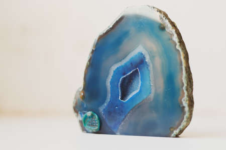 Large blue crystal of agate cross section isolated on white background. Natural translucent surface of agate crystal, blue abstract structural fragment of mineral stone