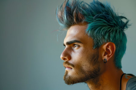 Young man with vibrant blue, messy hair and aa cozy blue and white sweater looking away in profile, expressing reflection and a thoughtful, wistful mood