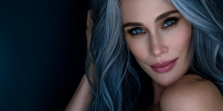 A woman with long flowing gray hair smiles warmly showcasing striking blue eyes. The soft lighting enhances her features creating an inviting and captivating atmosphere.