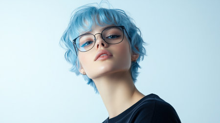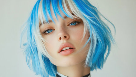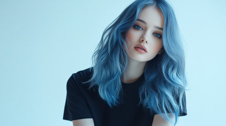 Captivating portrait of a young woman with striking blue hair and mesmerizing features, set against a soft blue backdrop that enhances her beauty and charm.