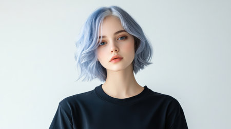 Close up of beautiful woman with white skin, blue short hair, wavy hair and a clear black t shirt, isolated in a light white studio. Portrait person.
