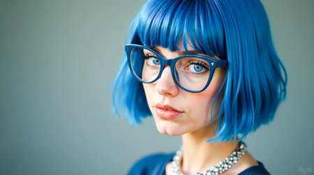 A woman with striking blue hair and stylish glasses gazes directly at the viewer. She wears a dark top and a statement necklace, showcasing modern fashion.