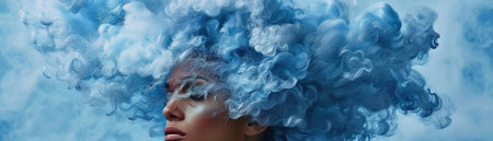 Vibrant blue highlights contrast beautifully with dark hair, creating striking visual effect against soft blue background. flowing strands evoke sense of movement and style