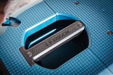 Strasbourg, France - Feb 9, 2020: Bosch Logotype on the handle of GAS 35 M AFC Professional Wet and Dry Vacuum Cleaner, 35 L with automatic filter cleaning dust class M