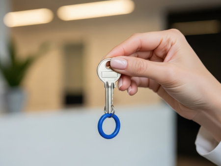Close up of woman's hand holding key on blurred background. Real estate concept