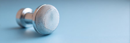 A single, shiny metal dumbbell sits horizontally on a light blue surface. The dumbbell features a textured grip on the weight portion.