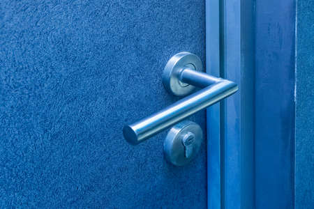 simple steel door painted with blue paint with a black plastic handle on it.
