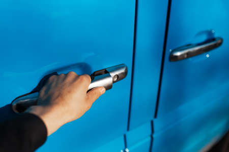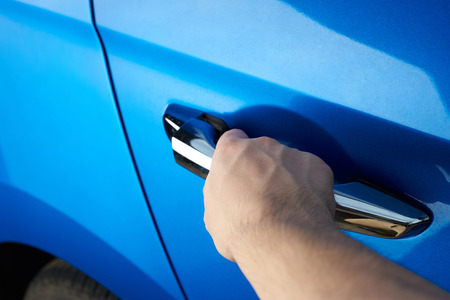 Close-up of male hand, opens the chrome door handle of blue car.