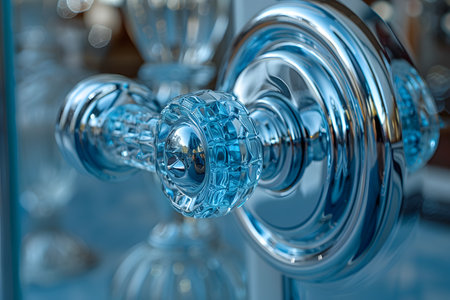 Close-up of a stunning crystal and glass door knob featuring intricate detailing and reflective surfaces, perfect for luxurious interior design and decor. light plays beautifully across the facets, adding elegance. Generative AI