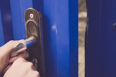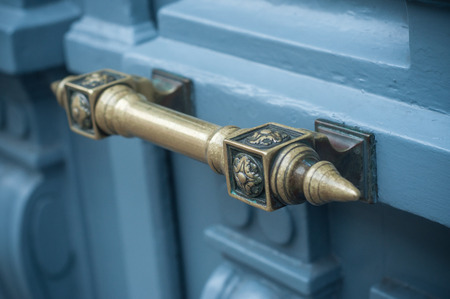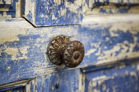 Vintage antique door handle on the old blue wooden door.