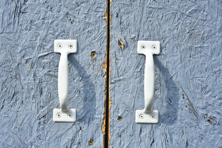 A close up image of old metal door handles on a garden shed.