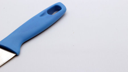 Kitchen silicone spatula in hand. A male hand holds a kitchen spatula with a plastic handle on a blue background. Selective focus.