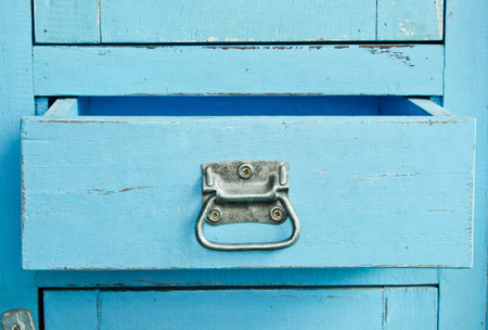 Vintage wooden blue cabinet with open drawer