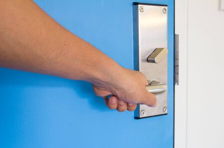Steel doorknob opening or closing the entrance or exit of the house, close-up.