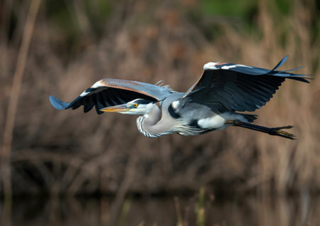 A majestic Great Blue Heron soars through the air with wings spread wide, its grey plumage contrasting with the blurred background of reeds.
