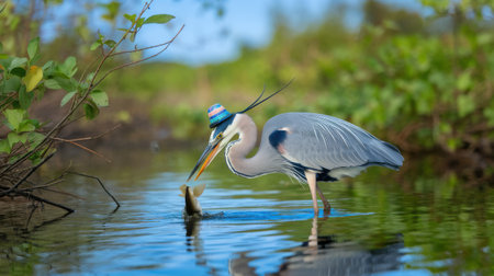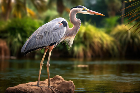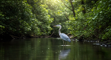 AI Generated. Blue heron wading in a tranquil pond amidst lush foliage