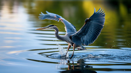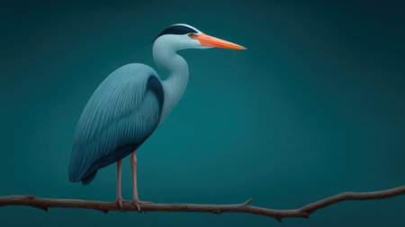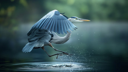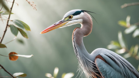 Majestic heron in tranquil misty wetland at dawn. That the image is generated using AI.