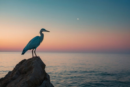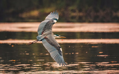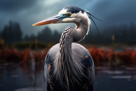 Gray heron standing majestically by the lake at sunset, displaying its elegant plumage and sharp beak