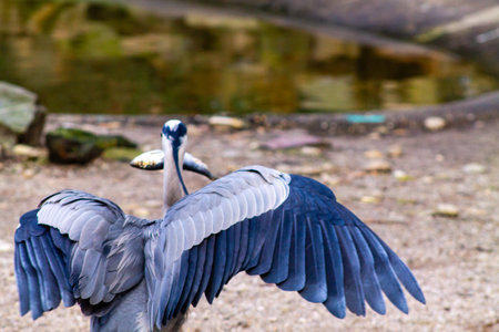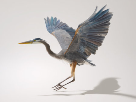 Portrait of a heron in the moment of take-off. Its wings are stretched