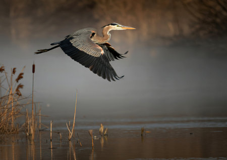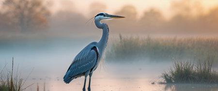 Great blue heron at sunrise in misty wetlands. That the image is generated using AI.