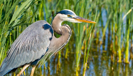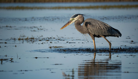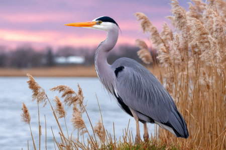 A regal great heron stands in shallow waters against a backdrop of lush reeds, the setting sun casting a warm glow over its elegant plumage.. AI Generation