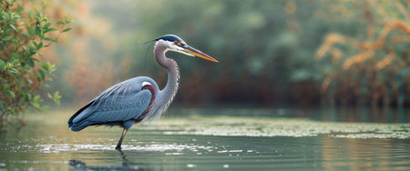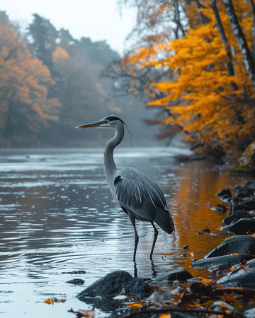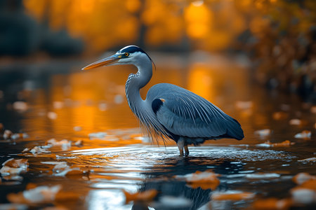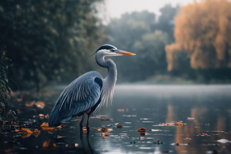 Heron stands gracefully in calm water surrounded by golden autumn leaves, reflecting serene fall scenery. ideal for nature-themed prints, showcasing elegance and the peaceful essence of seasonal transition. Generative AI