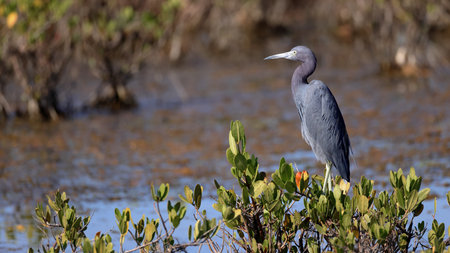 This beautiful bird is a little blue heron, a common sight in the wetlands of Florida