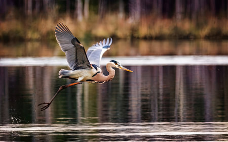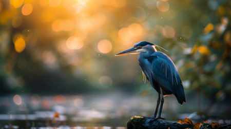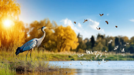 Elegant heron captured by the water against fiery autumn backdrop, showcasing wildlife beauty. A.I.