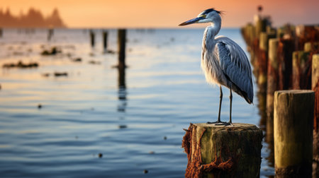 blue heron perched on a wooden post, showcasing serene maritime themes in a narrative-driven visual storytelling style. the vibrant orange and gray hues, bathed in golden light, create a captivating contrast against the spectacular backdrops. this documentary travel photograph captures the essence of the scene with its saturated colors. ai generated