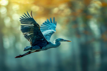 Blue heron is flying through the forest with its wings spread wide. Generative AI.