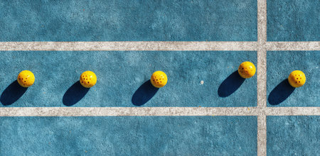Aerial view of a blue paddle court with yellow balls positioned in a row, highlighting the contrast of colors and textures, creating an engaging sports atmosphere