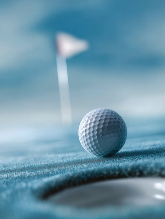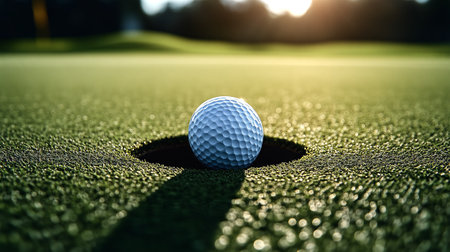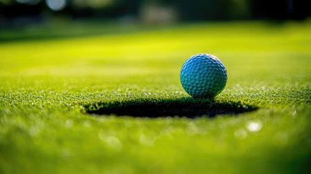A close-up view of a golf ball resting near the hole on a well-maintained green, highlighting the lush grass and depth perspective, ideal for sports enthusiasts.