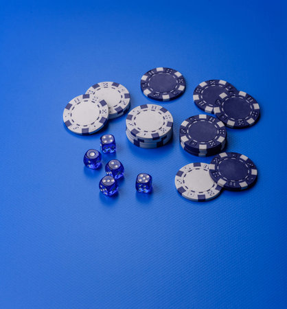 Casino dice and chips on a colored background, poker, gambling with bets. Dice and chips as a background for your design