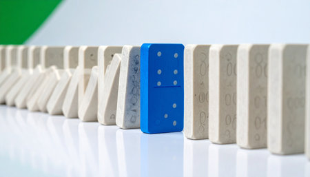 In a long line of identical white dominoes, one bold blue piece stands firm, breaking the uniformity.