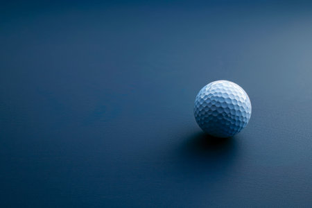 Stylish golf ball isolated on empty dark blue background, close up shot with blank space for text.