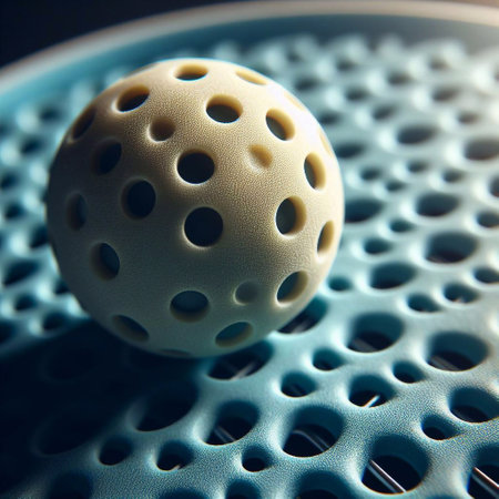 A blue padel court displays four colorful balls on the surface, emphasizing textures and shadows, creating an engaging atmosphere for sports lovers and visual storytelling