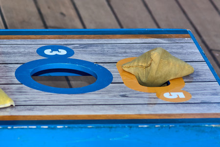 Minimalist cornhole board with scoring numbers and striped beanbag on wooden deck for outdoor entertainment and leisure play.